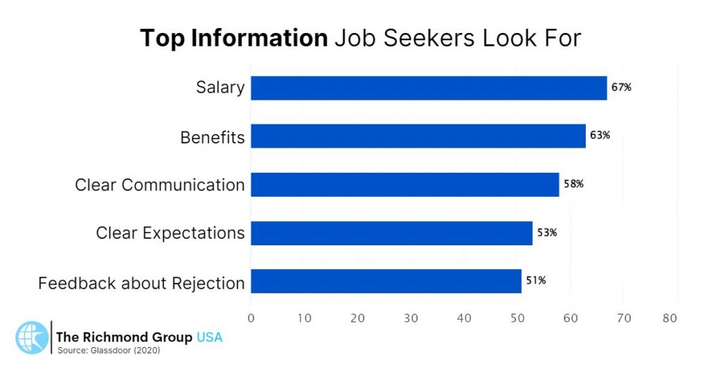 The graph below outlines the top information Job seekers look for when applying for a job or researching your company.
